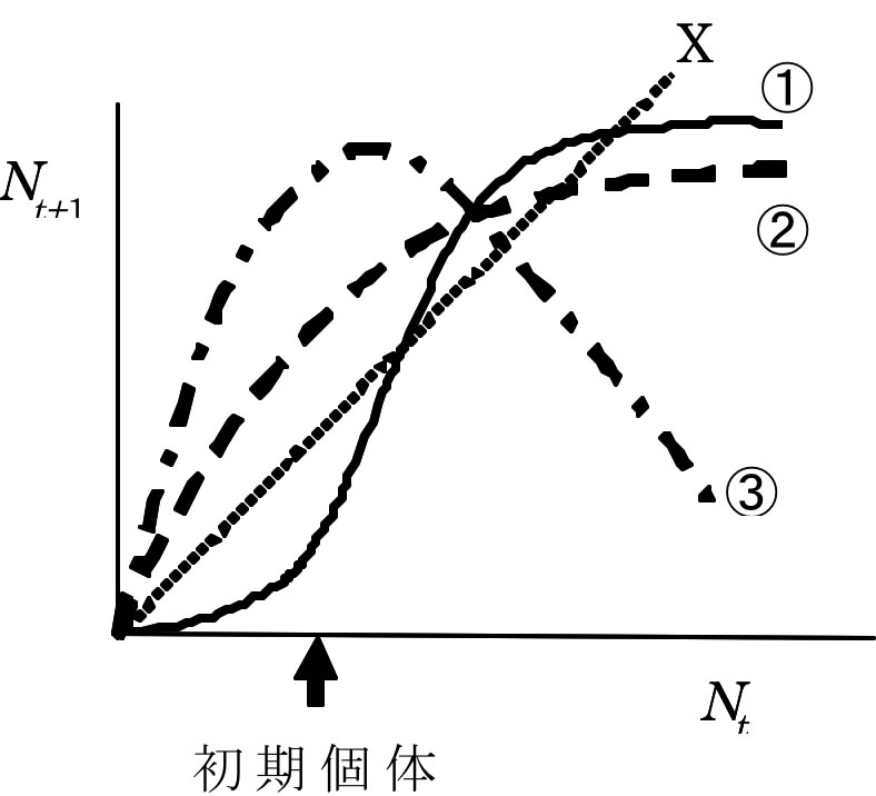 ①では個体数が順次減少し,絶滅に向かう。希少種でよくみられる。②は典型的なS字成長(ロジスティック成長)を示すものである。③は内的増加率が高い場合で,密度効果が時間の遅れをともなって強くはたらくため,個体数は周期振動する。